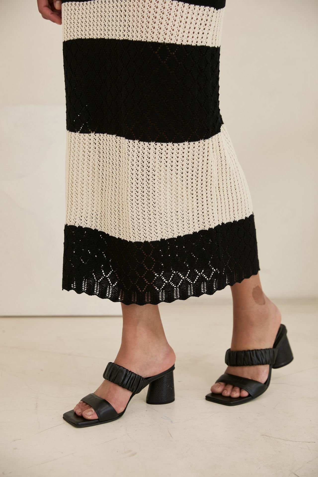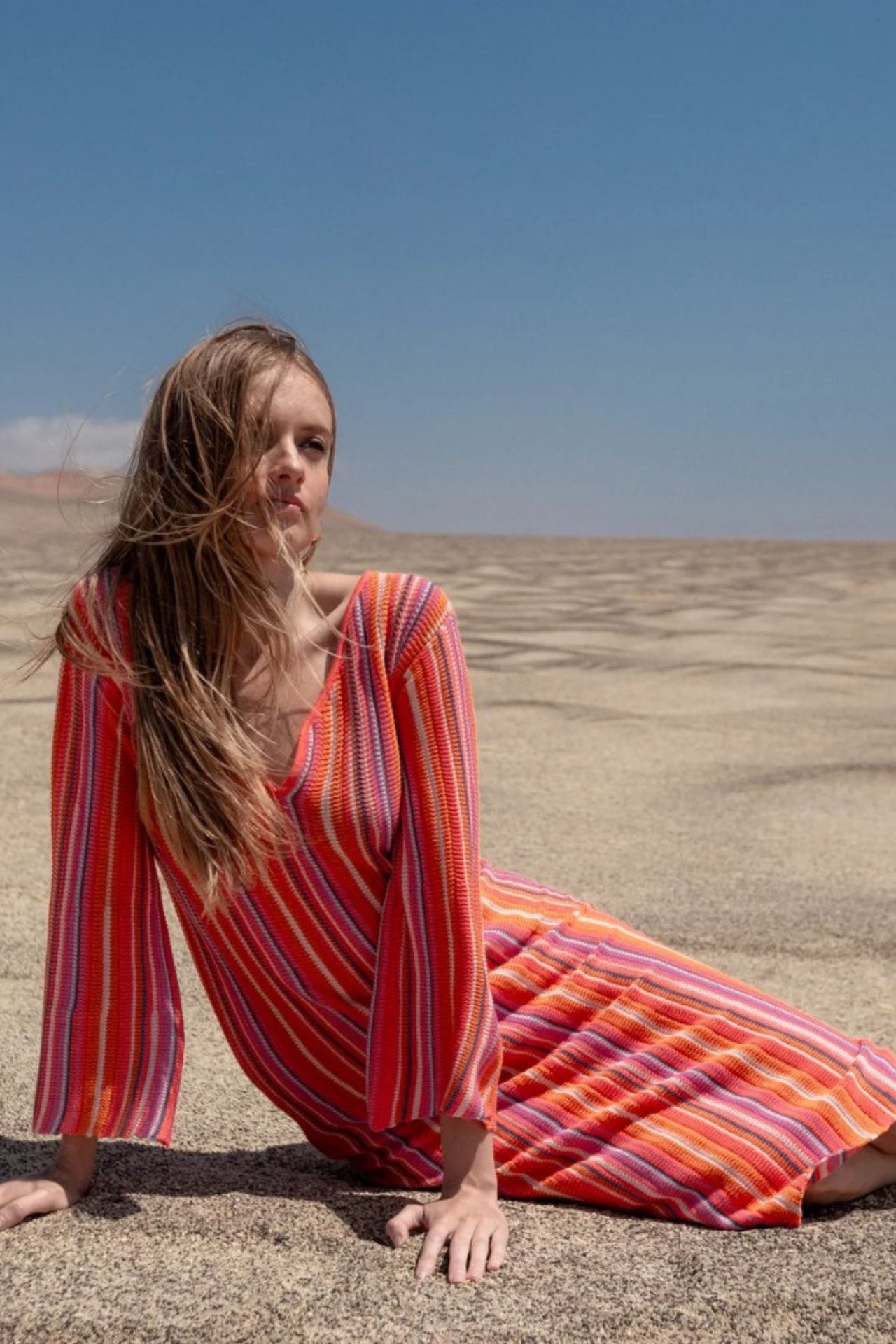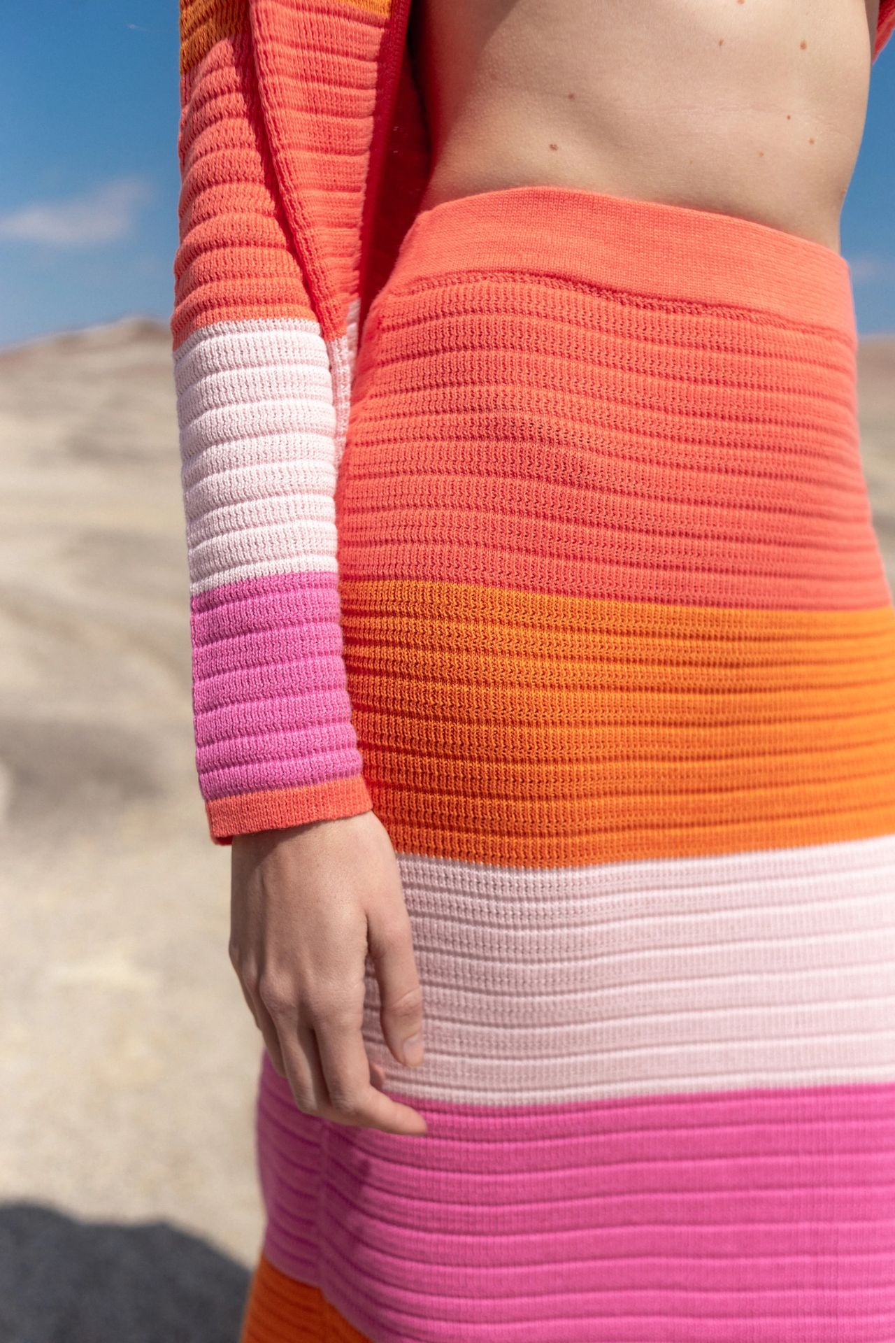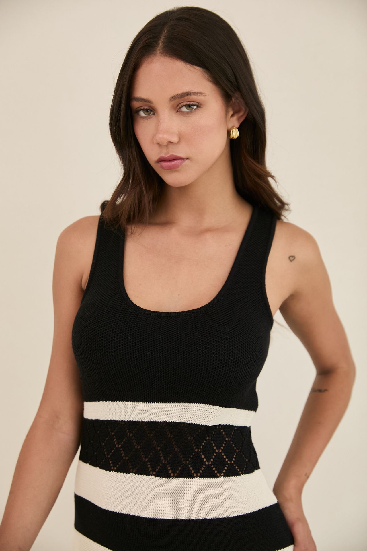 Vestido tejido en hilo de algodón con poliéster. El tejido expande, no es rígido. Lavar en ciclo delicado con agua fría. Secar con aire frío, o al aire libre.