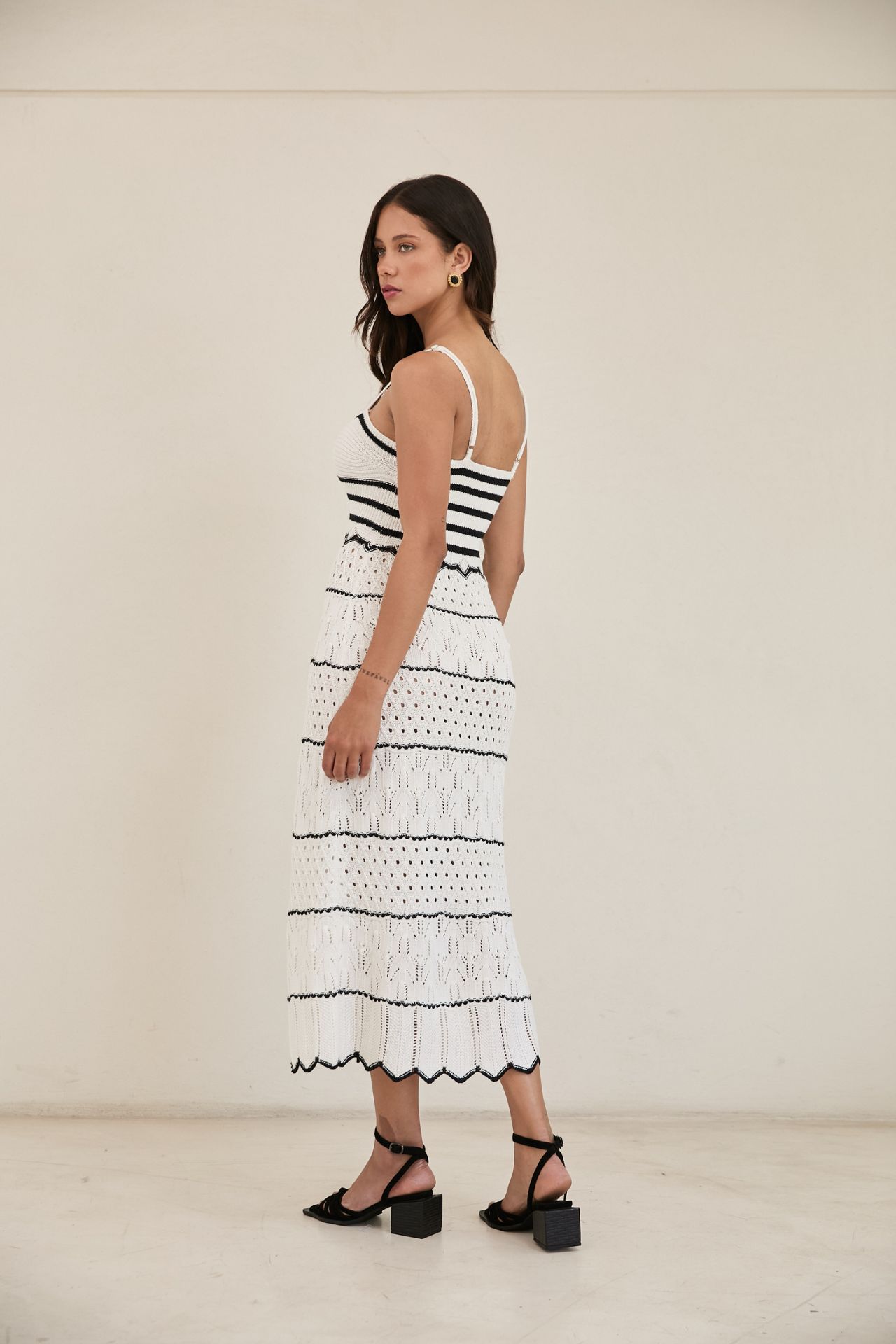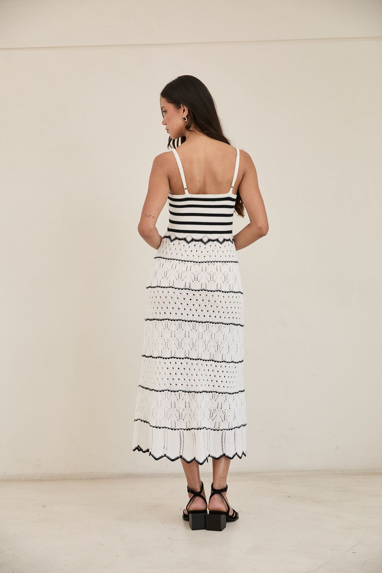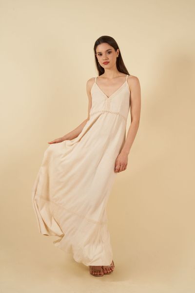 Maxi vestido manga cero fabricado en cotton mix, con aberturas laterales y detalles de calado. La talla standard puede ajustarse hasta un jean talla 30 o de bra hasta una talla 36B