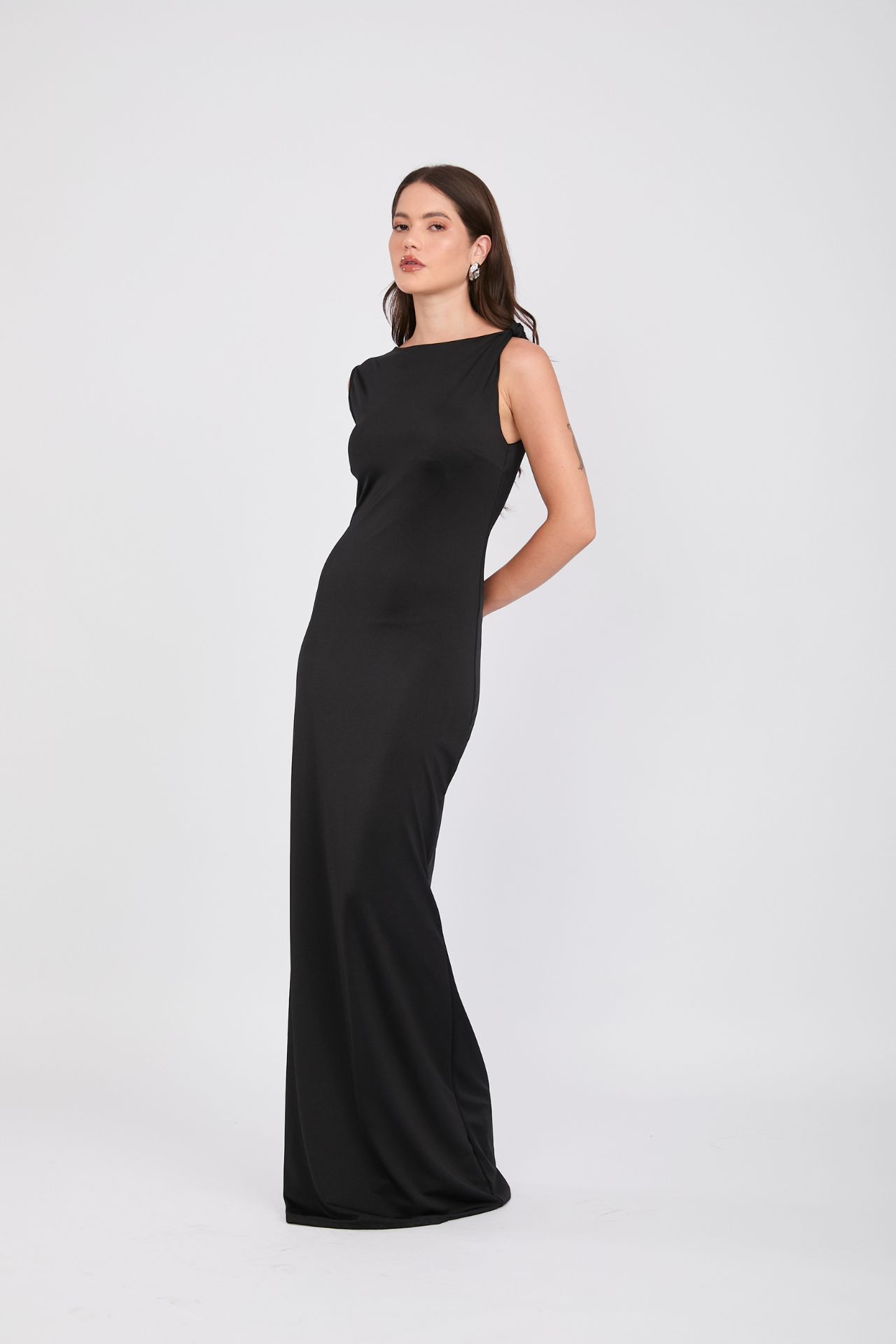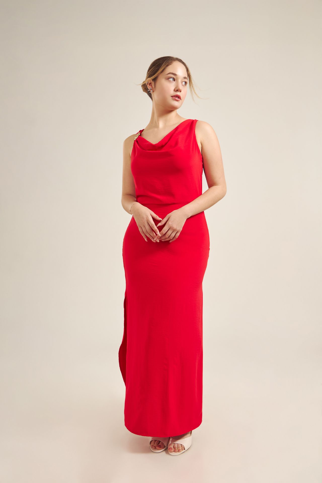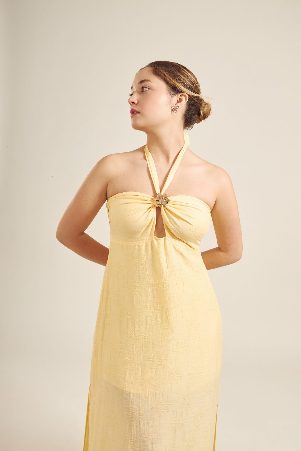 La modelo mide 1.75 y está usando la talla S en Vestido.